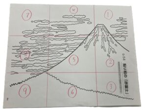 ぬくもりの家では日本を代表する山、富士山をぜひ壁紙で表現しようと取り組みました。基本となる下絵は雑誌からいただいており、拡大し9分割して一人ひとりがご自分のペースで取り組めるよう工夫しました。